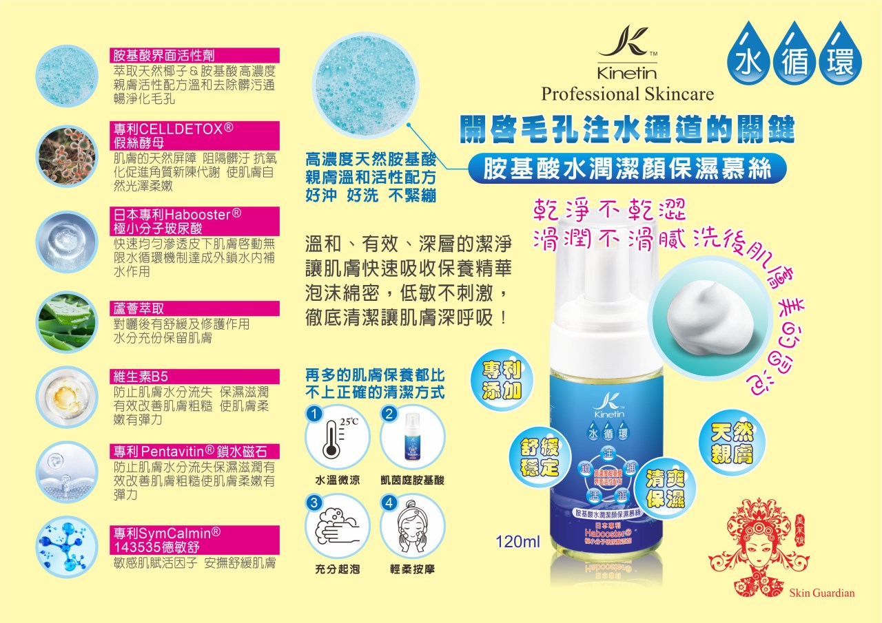 潔顏效果極佳的高濃度胺基酸界面活性配方,並結合了多項專利有效的清潔、